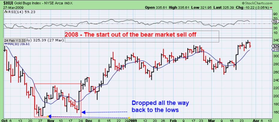 Reminder HUI 2008 – This shows HUI dropping all the way back to lows in 2008,  twice.  It CAN happen, but riding JNUG is NOT good when that happens.  I got stopped out of 1/2 of my JNUG yesterday. I dont know whether I am happy about that or not.  I locked in some profit, but now may have to re-enter higher if Miners take off.