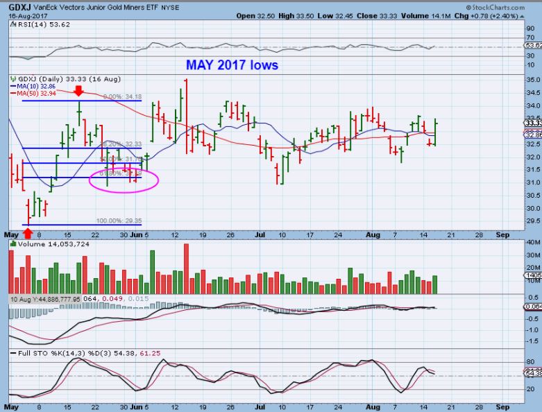 GDXJ MAY 2017 was the lows for last year in GDXJ, even though GOLD put an ICL in in July.  So I wanted to look at MAY 2017 for GDXJ and see what the drop looked like.   In May GDXJ dropped beyond 61.8%, but never closed down below there. I’m was just looking at this to see if  the recent drop of 61.8  is normal or abnormal?   So far, it has done this before ( but no MACD cross in May).