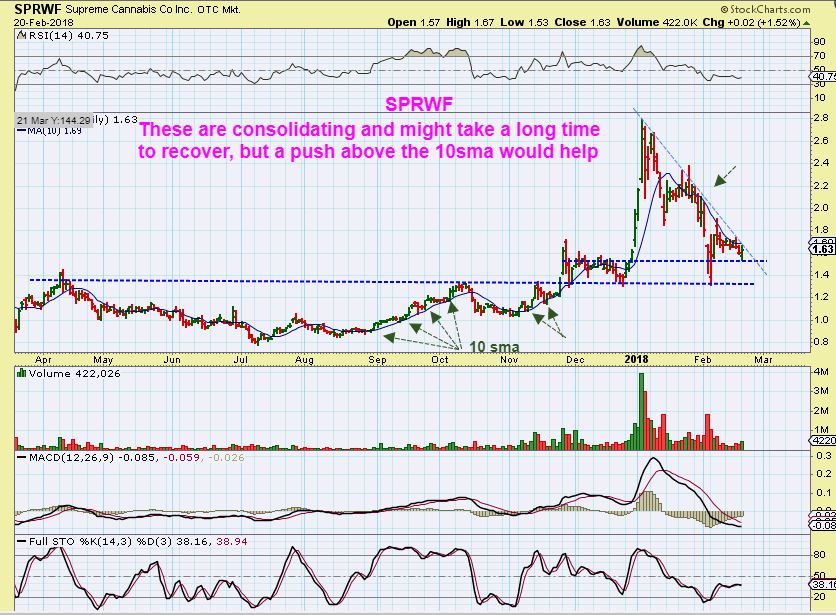 I am also still watching MJ stocks as they consolidate. Several are also moving back above their 10sma, and this is what you want to see to make sure that the strong rally higher wasn’t just a 1 hit wonder.  I liked  TWMJF, ACBFF, OGRMF, SPRWF, etc yesterday on a 3 month chart.