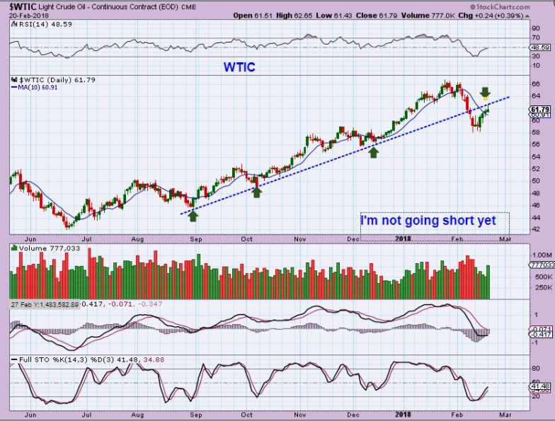 WTIC – Is this a good place to short Oil?  A back test of this trend line? Maybe, but I am going to wait for further signs. Oil daily cycles last 30-50 days, and this is still quite early.  It did tag the trend line & drop back though.