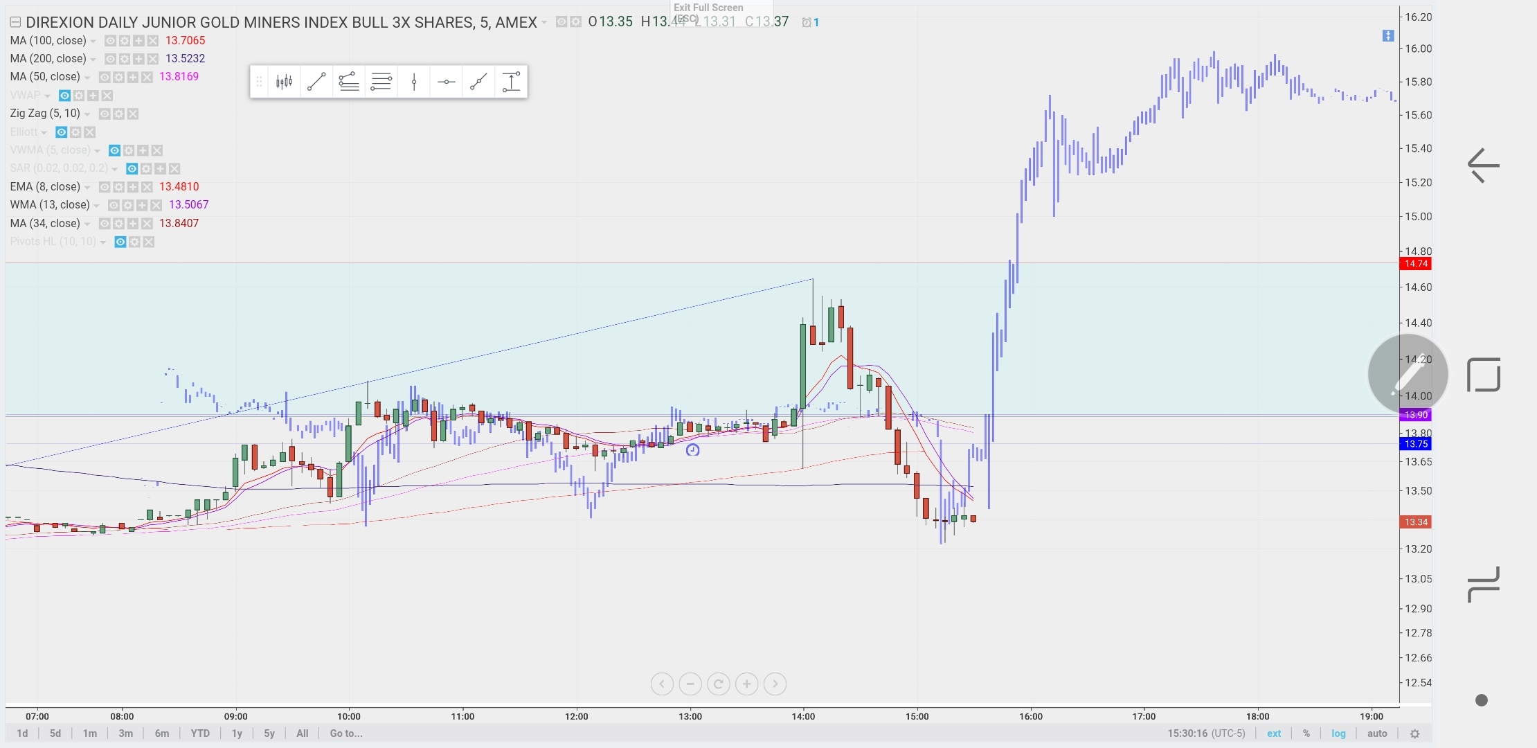 Seems like everything is kind of just meandering around waiting on news. Gold just kinda flat, dollar banging around 89.90. The jump in JNUG this morning hopefully is a tell. I was hoping for a quick trade to $14.40 or so and already have hard stops in on my trade in case I’d does go south while I’m working. Might get stopped out on a fake out move but won’t be able to watch the market til after Fed so gotta be safe.