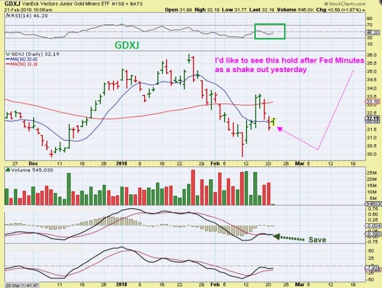 GDX – So GDX dropped below the 10sma & closed there. I hear some say that is the death signal, but it does happen and can recover.  In fact, look at Jan 8th.  If that wasn’t a DCL in your eyes, then it was just a close below the 10sma for 3 days and then a continuation higher.  A 1/2 cycle low.  Personally I DO NOT like that MACD/ RSI  crossing down as a warning.  I feel we need to Turn higher now or beware.