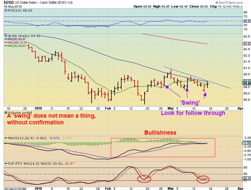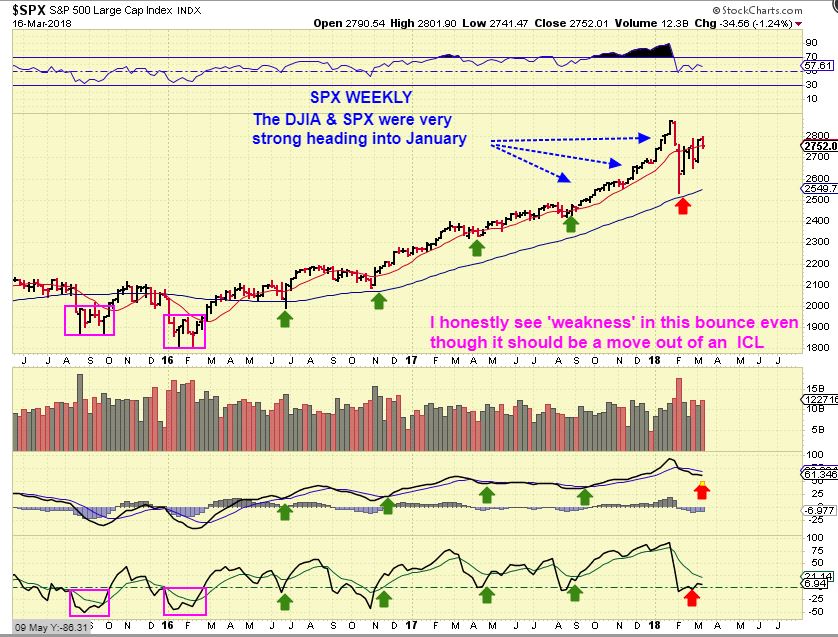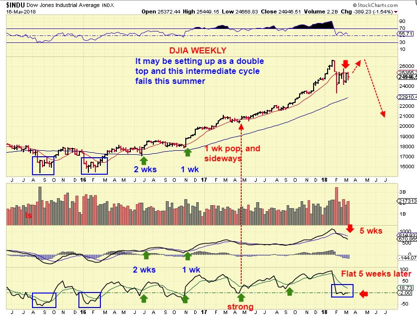 DJIA – The DJIA was racing higher for the final 8 months of 2017, now it cant do any better than a choppy sideways move for 5 weeks, right? So far this is 5 weeks sideways, and read the chart. 1 & 2 week Pops turned up the lower indicator. I am not seeing that now, it is flat (so far anyway). Here I drew a double top possibility?