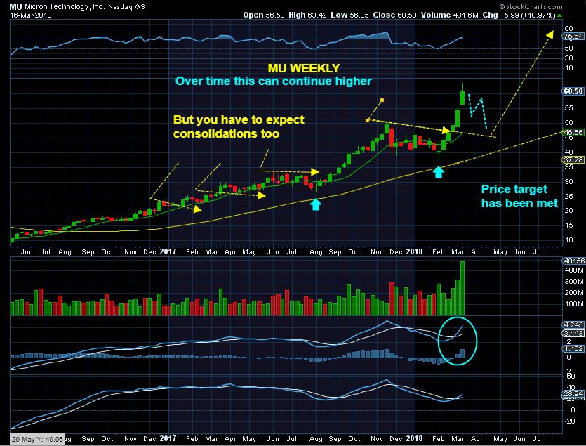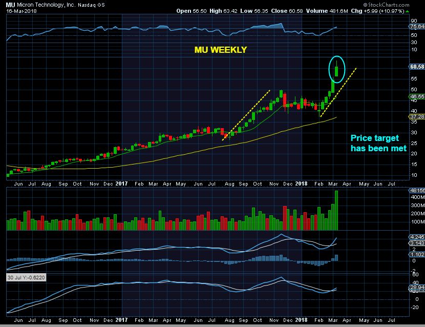 MU WEEKLY – I feel that this looks like an exhaustion gap higher, reversal weekly candle. My price target has already been met. Two thoughts come to my mind here that I want to share with you …