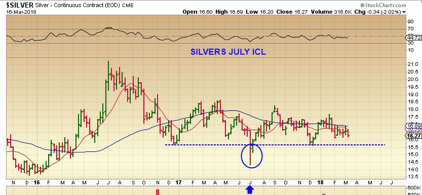 SIDEWAYS SILVER – Notice the DIP to the ICL in July 2017 was lower than the DEC 2016 ICL. Now we find ourselves back at the recent series of lows and the COT is rather bullish. This has been a bit uncommon and puzzling, and I have a few ideas of what may be taking place. I will explain at the end of the report. Some Silver stocks actually look good so far.