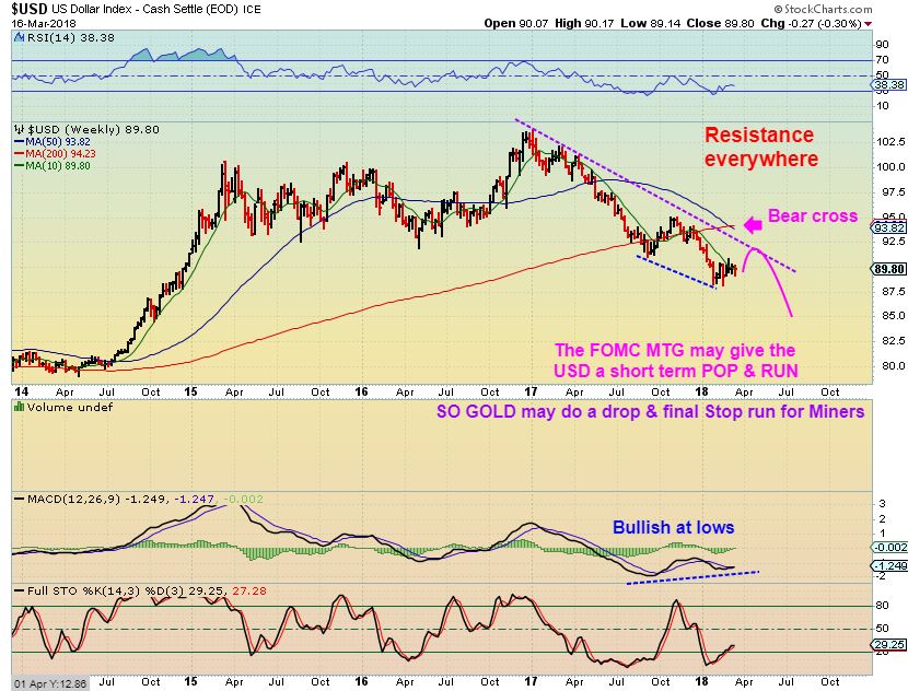 USD WEEKLY – That MACD has pretty good divergence, and this looks like the USD wants to go higher for a bit. That should drop Gold over time.