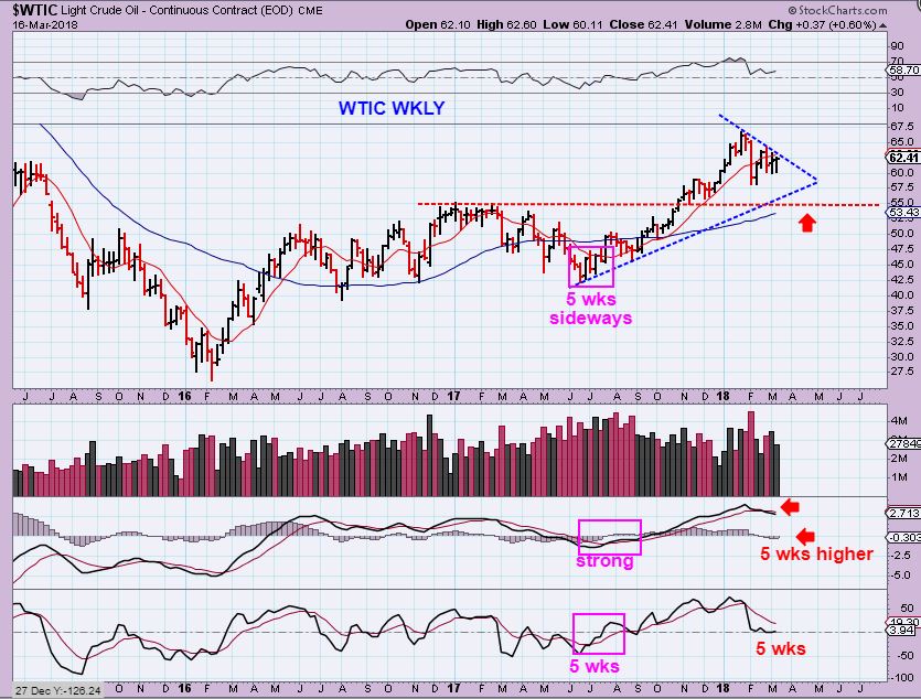 WTIC – The COT is still bearish & I did the same analysis on this chart. Last summer we saw 5 weeks basically sideways out of a sell off and ICL. That 5 week sideways move corrected the MACD & Lower indicator last summer. Right now, I see 5 weeks and weakness in those indicators. I do expect lower price in Oil , but I am now no longer short or long. The whip saw daily was distracting.