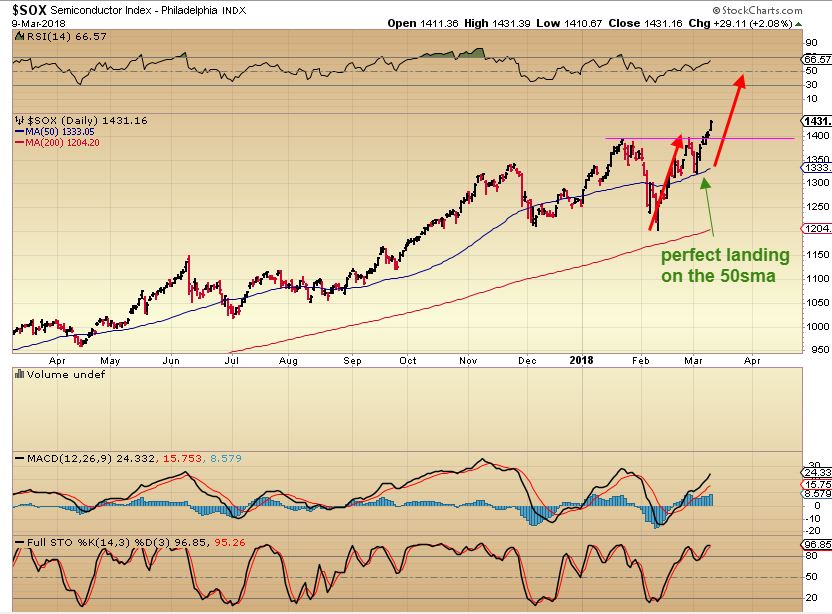 SOX – The SOX ran to January highs, dipped to the 50sma, and has now broken out to new all time highs. I am hearing many saying how bullish this break to new highs is, and yes, it usually is. This CAN be a very bullish situation, but it depends on the economy going forward too. Notice also …