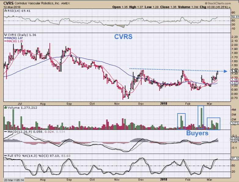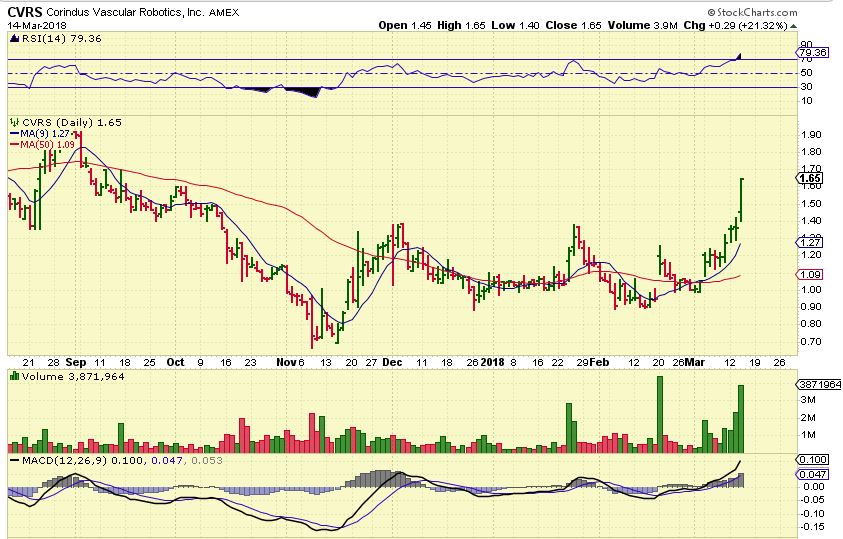 CVRS from March 13 – a buy with the good volume pops. A couple of people wrote to me that they took this, and where would I sell?