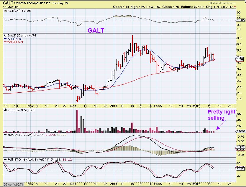 GALT –  2 days later it  bounced higher & then it dropped back to the 50sma  yesterday.  I was asked if I am stopped out.  Not yet and since it broke the 50sma in early March, I may allow it to do that again.  Unfortunately this moves quite a bit daily,  so my stop may have to be $4 based on this chart.  That is a bit more of a loss than I want to take, but this went from $4.25 to $5.82 in 2 days last week, so I cant use a tight stop ( Unless I dont mind getting stopped out at the 50sma & buying into a reversal if that happens).