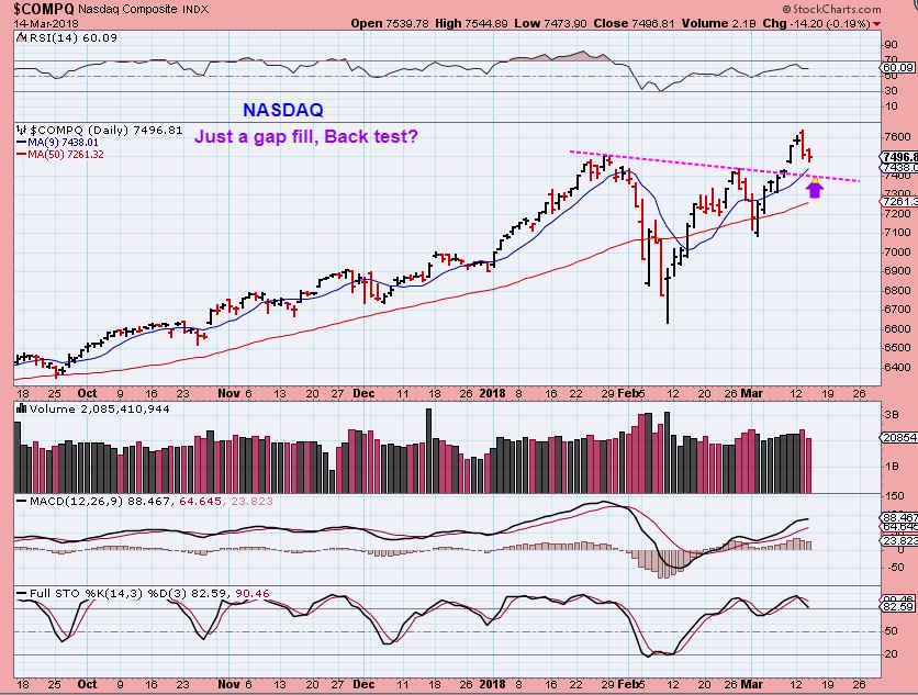 DJIA – The Dow is actually stuggling at the 50sma ( please don’t write and blame this entirely on G.E.  🙂  ), and it is a bit bearish at this point.  The DOW was the rocketship of November through January, and then Crashed hard. This now only has a day 11 peak, that needs to change. This could be support however, with a push higher to follow.