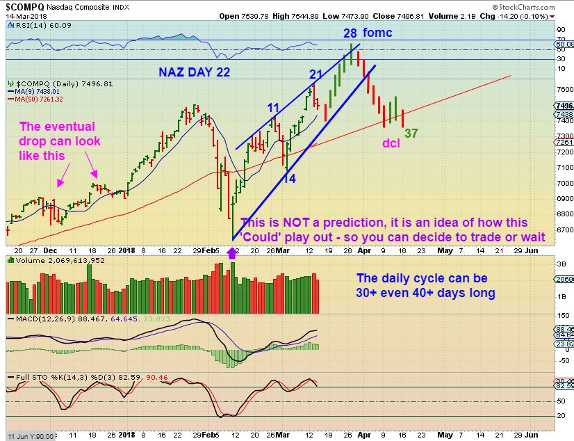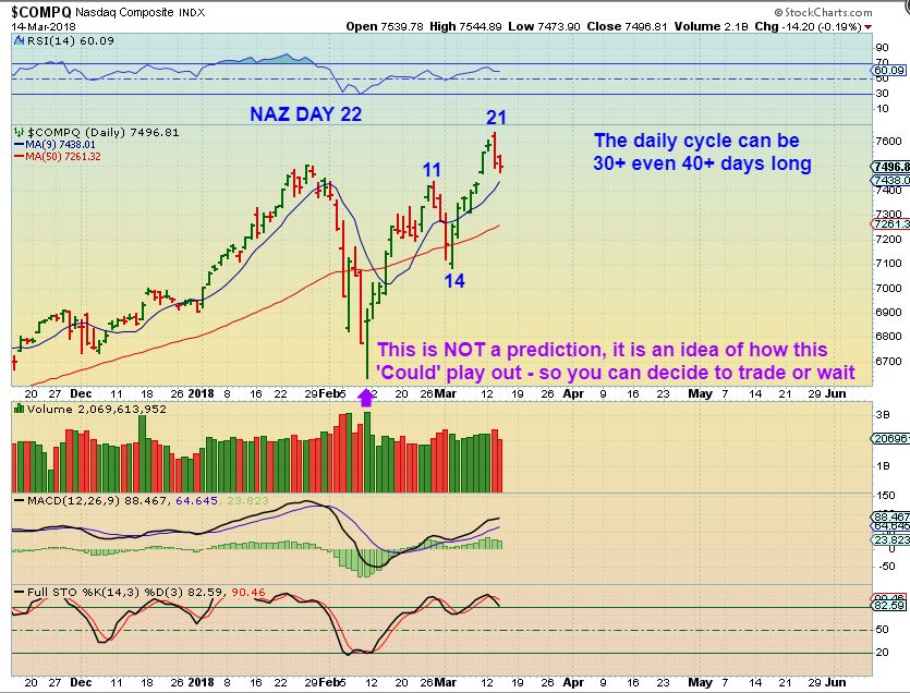 NASDAQ CHART #2 – It is possible that another leg higher unfolds ( Guessing near day 30ish) and then a drop into a dcl.  The DCL could back test this break out or the 50sma in April. Buying here may give you a run higher & then a drop right back down to this area for a dcl.   This would give us more upside & MAYBE the SPX could even break to new highs by then.