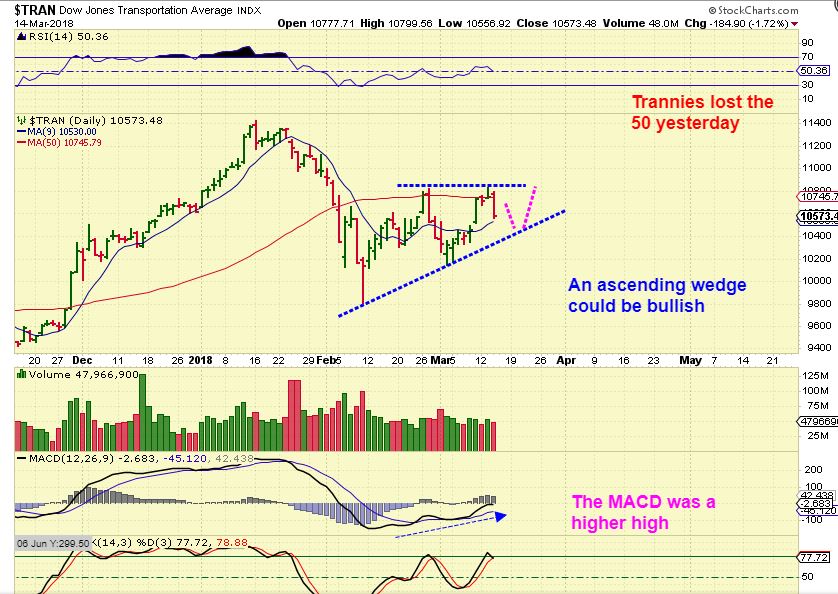 TRANNIES – We have an FOMC MTG next Wednesday and the Trannies looked a bit weak at the 50sma too, but if this becomes an ascending wedge & breaks higher, it is bullish.