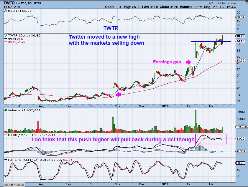 TWTR – Another stock breaking out with the General Markets selling down. The MACD is not confirming this high, so it may pull back later when the markets drop into their dcl.  The 50sma is climbing, and this can run & pull back to the 50sma later like it did in January.  As mentioned in a prior report, the earnings Gaps may never fill.