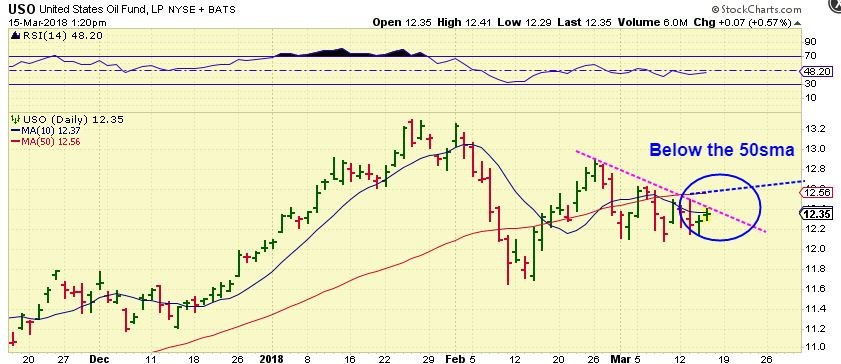 This is a chart of USO ( for oil) , you could get rid of DWT if the overhead down trend line is broken, but mostly I think that Oil under the 50sma is good. A break above the 50sma may be bullish.
