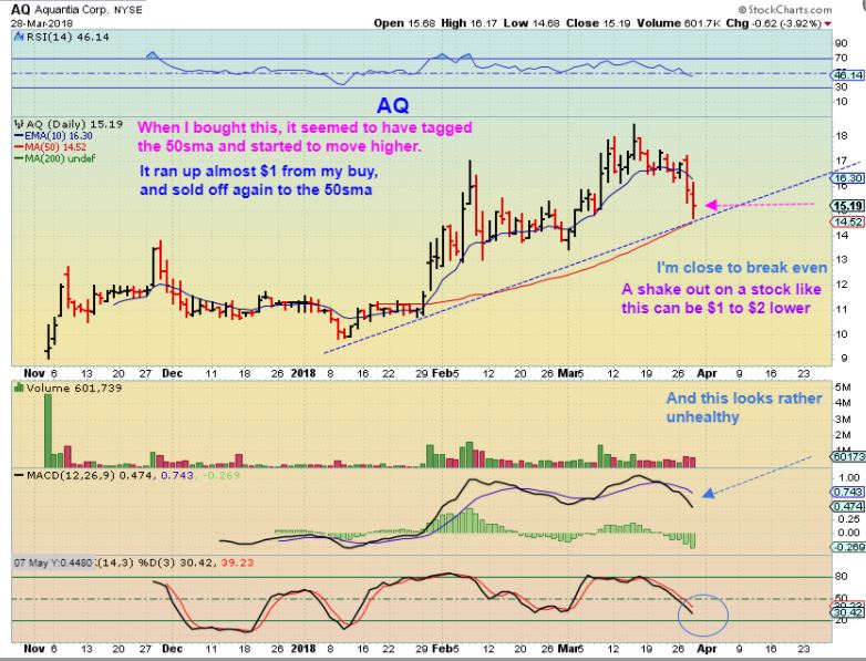 Conclusion: There is a time when ‘Good set ups’ and even ‘Average set ups’ play out very well, because the market direction is in their favor.  In a Bull Run, many stocks just join in.  There are also times like now when the most Bullish of set ups do not find follow through.  When the Markets are Choppy,  the set ups are less reliable, and the follow through can be put on hold.  I am holding a few trades ,  but going forward I am not adding any new ones until this choppy directionless market gets some direction.  The General Markets actually look as though they could drop even further.   Yesterday I mentioned that even the big reliable Fang stocks were choppy and selling off and posted charts of GOOG, FB, NVDI, etc.   It won’t hurt to wait for a buying opportunity that is safer or more reliable.  I need to just go for a walk during the day,  since I do this for a living and find a good set up difficult to pass by!  🙂     I still recommend waiting  for a dcl. before adding anything more,  and I will stop out of current trades if they go against me.  WAITING IS BORING, BUT IT SAVES ONE FROM CHIPPING AWAY AT FUNDS. MOST TRADES ARE HAVING TROUBLE WITH FOLLOW THOUGH AT THIS TIME.