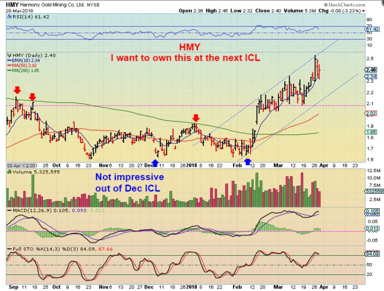 HMY – THIS Is not following GOLDS CYCLES.  WHY Do I say that? See that the Dec ICL lows to Jan highs were tiny & Gold rallied fast.  HMYs Feb lows to now were Big Gains.  I dont know how this will hold up if Gold sells down into an ICL in April/ May,  but I would think that owning this one after a pull back would be a good idea.