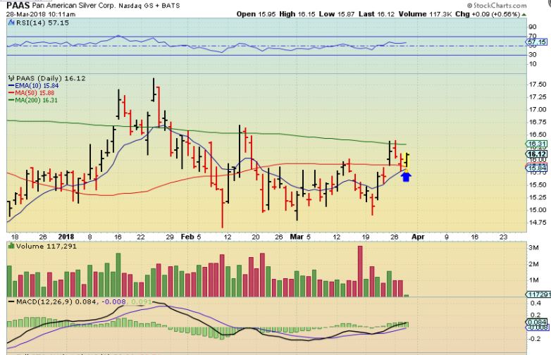 PAAS –   PAAS was still holding above the 10 & 200sma today,  despite the GOLD & SILVER Sell off the last 2 days. This was in the morning and it did close lower, but remains above the 10 & 200sma.