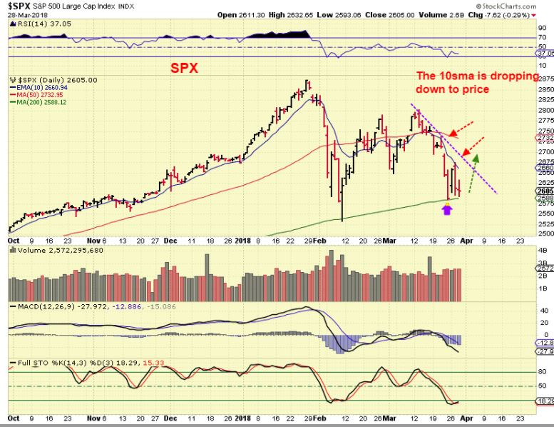 SPX –  It is still there.  The markets have been choppy, rallying, dropping and really not going anywhere.   This has allowed the 10sma time to drop lower, so now it will be easier to move above it.  IF the drop has finished and we get a dcl here, the ICL was at the  February lows.
