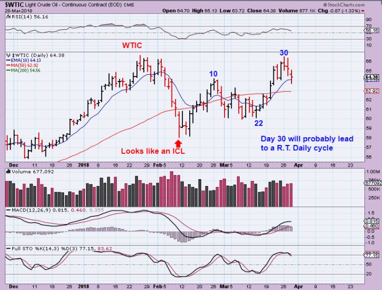 WTIC  – The Oil inventory report was released and OIL put in a doji.  Oil has formed a swing high on day 30, and daily cycles in Oil last 30- 50 days. This ‘Doji’ Wednesday  was NOT as simple as this chart makes it look.  Yesterday OIL was very  choppy…