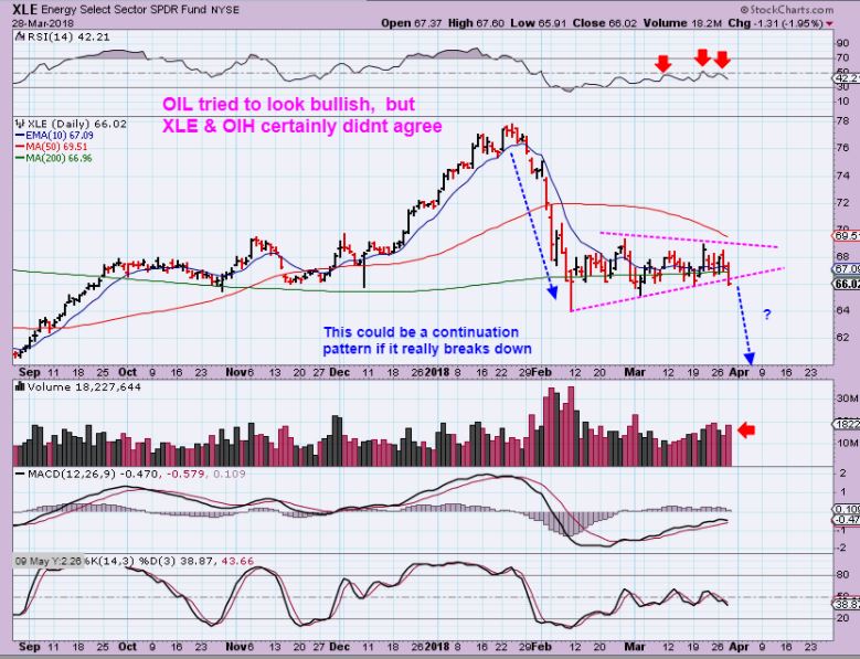 XLE –  So Oil rallied & dropped and rallied, but the Energy Sector ETFs looked to want to break down.  Maybe this is a clue to Oils real direction?  MAYBE DRIP & ERY will be a good trade  when Oil dips to a dcl. ( Short Energy).