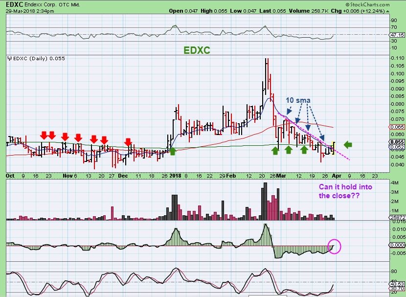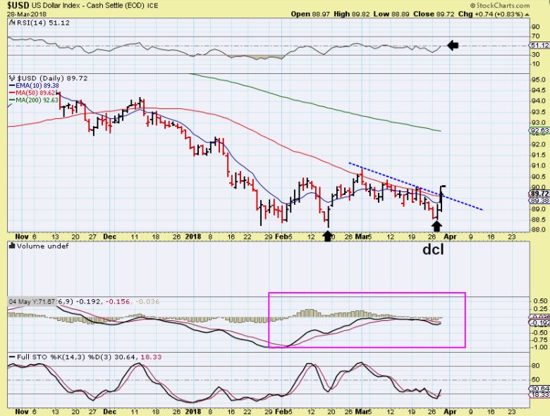 USD  – I drew in the candle above 90 and we see a trend line break & a close over the 10sma.  This is in the proper timing for a dcl.  Notice that the last DCL or ICL  did not rally much, but we’ll see how this one goes now that it got above the 50sma.