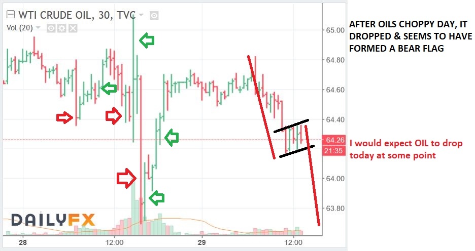 It wasn’t done.  This is now a 30 minute chart and as the day went on,  it rallied again and sold off again, even lower.  Was Oil going to be Bullish or Bearish after that report?  It was just going to be wild and choppy.  And then after this crash …