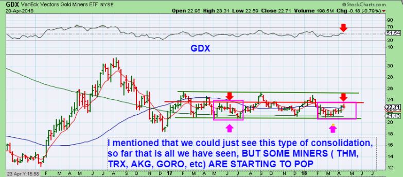 Many stocks in that blockchain area ran swiftly in Oct- Dec have now based out and seem to be setting up to run again.    Medical Marijuana is another area that ran almost straight up last the end of 2017, many doubling and tripling. Now we’ve seen a few perking up out of recently formed bases, so we really have not had a shortage of trades to look at.   I think that most of these set ups will continue to play out bullishly too.  Finally,  most here have traded the Miners in the past.   The gains in that sector, especially when timed correctly, can be exceptional.  I am really excited about what is happening in the precious Metals sector, and I look forward to the coming weeks. These can be very profitable trades, and since they can also often be bought and held for weeks, this allows you to relax and just enjoy the ride ( and maybe you’ll even have time for a few other hobbies that you enjoy on the side).