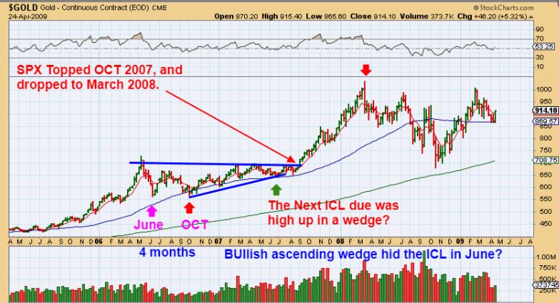 GOLD WEEKLY 2008 #1–  When did the General Markets top?  Oct 2007.   Notice that Gold rallied for 6 strong months after Oct 2007, then it put in an inverse H&S and rallied into 2011. In 2008, Gold back tested the BLUE WEDGE break out as it dropped into an ICL.  I WILL USE THIS CHART AGAIN WHEN I DISCUSS GOLD.
