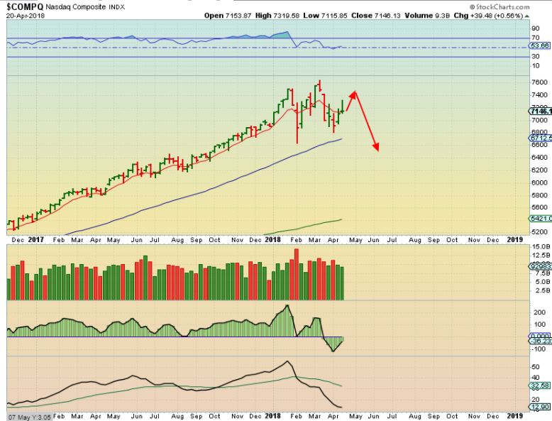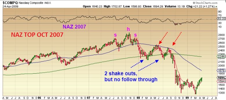 NASDAQ 2007 top  – A different kind of top, not a double top like we had with the SPX.  The NAZ had a higher top that formed a H&S. Note that THE TOP was also Oct 2007.  Currently  coming out of the FEB lows in 2018, we also just saw the NASDAQ form a new higher high, while the SPX & DJIA did Not.  Are we currently forming a right shoulder here in 2018 too?