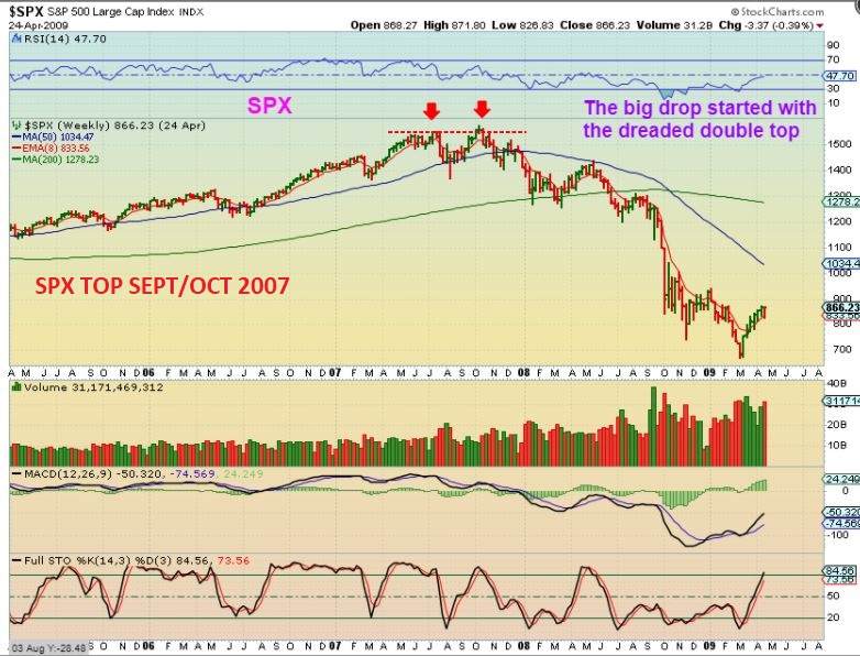 LET’S LOOK AT THE SPX 2007 top –  It came in the form of a double top for the SPX.  Note that OCT 2007 was THE TOP.
