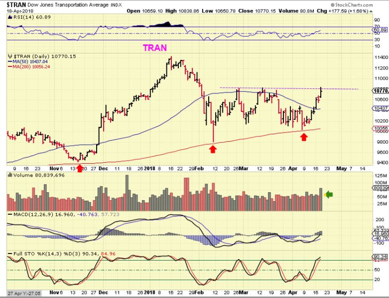 TRAN APRIL 19- What about the fact that the transports broke higher this week?  I posted this nice push higher while last Wednesday with good volume.