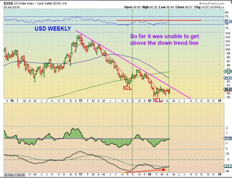 USD WEEKLY – The USD is in a major down trend and so far has been unable to cross the magenta down trend line. 91 or 92 breaks that line, so we could see a false break out.
