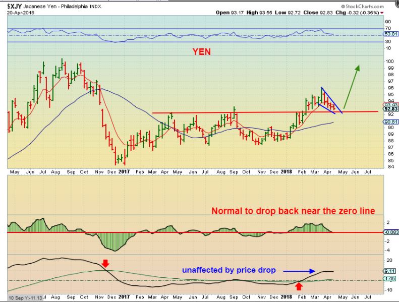 YEN WEEKLY – The YEN broke to new 2017/ 2018  highs already, and Gold tends to follow the YEN. If Gold did this type of break out, say at the FOMC MTG in early May, it could put in an ICL dip like this yen back test, as a June ICL too.  Just an idea of how things could play out.