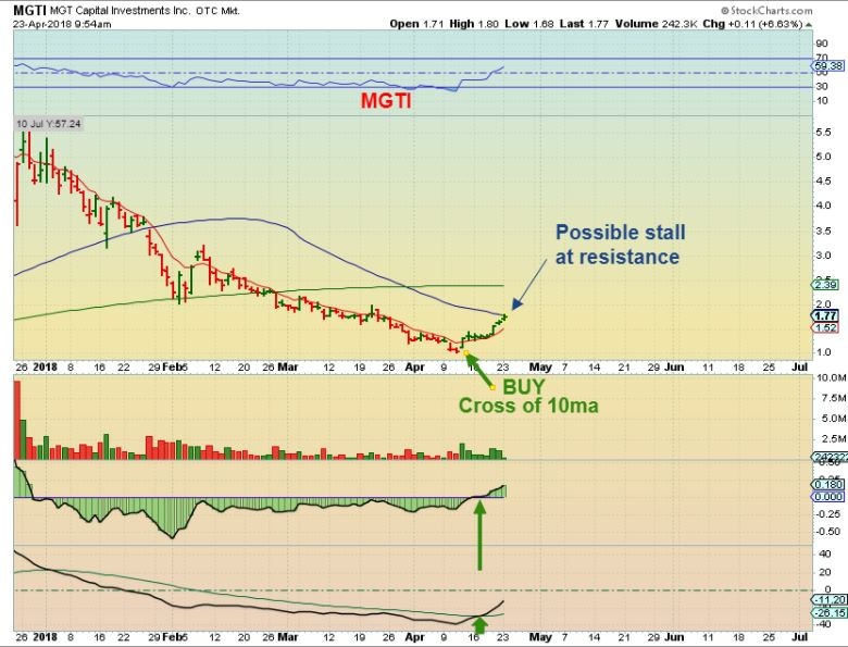 MGTI is at resistance and it could stall / pull back/ or MAYBE break out- but this is where I would usually take off 25% if I was heavily invested. I won’t sell it all, as you can see, it is on a buy signal and remains quite bullish for now