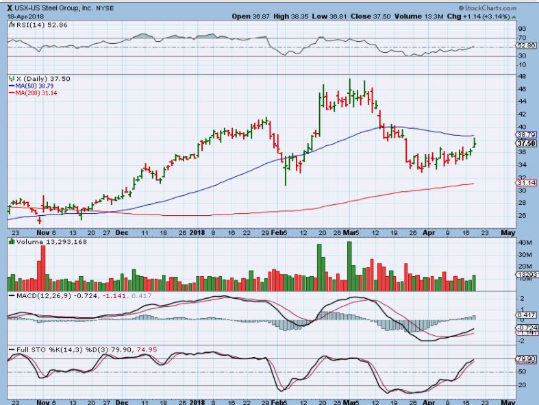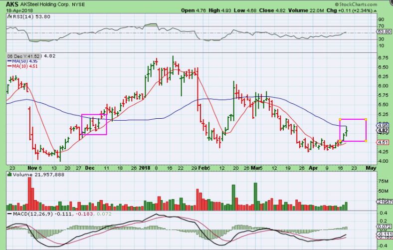 X–  Take a look at charts of  X, AKS,  HBM, TGB, etc and they are moving out of bases & pushing on their 50sma.  THIS may be the next bullish set up ready to run.  I would wait for a strong push or a close above the 50sma – that could be considered a buy.  You can buy it here with a stop under recent lows too, if you see volume increasing like we see with ‘X’