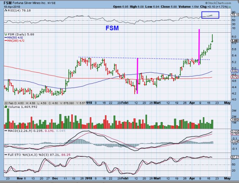 FSM –  In the comments section I mentioned that I sold my FSM  (Still have my CDE, AXU, TRX, NAK, etc).   Why? Some Silver stocks have been running strong for weeks before Silver popped, and I just wanted to lock in gains for now.  This could bull flag and keep going, but it looked like it is overbought.  NOT everyone should sell, I am a trader by day…