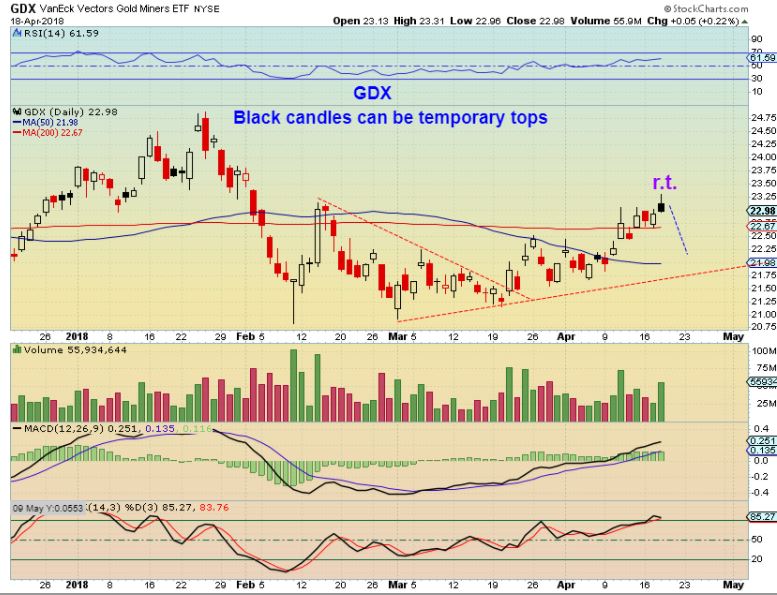 GDX – So what we have here is a right translated daily cycle, with a possible black short term topping candle.  IF Golds ICL is not going to come until June, this can dip to a dcl and make another run higher. For now, it has turned into a bullish base, but…