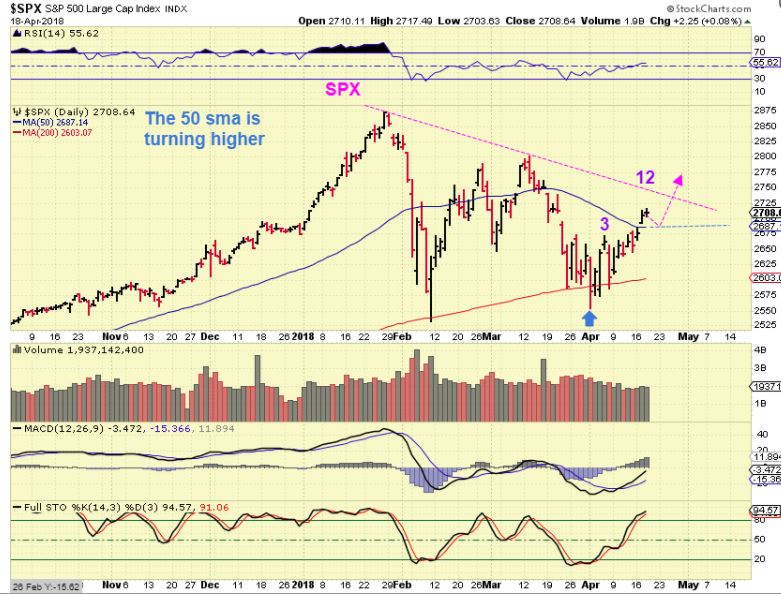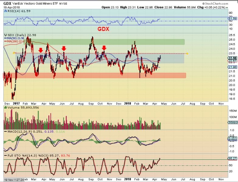 GOLD BULLISH – THIS WOULD BE A BREAK OUT & BACK TEST ICL in JUNE or JULY.  I personally would love to see No Break out, and a drop as I originally expected, or a quick fake break out & roll over and that could happen, but Many Miners are now acting more bullishly. A drop below the 200sma into an ICL sooner than later would be great, but we MUST be ready to adapt if markets change, accept possibilities that seemed less likely before, and continue to read the charts.   THAT MEANS THAT I AM STILL HOLDING MY MINERS FOR A BIT LONGER.  You will see this chart again in the weekend big picture report.