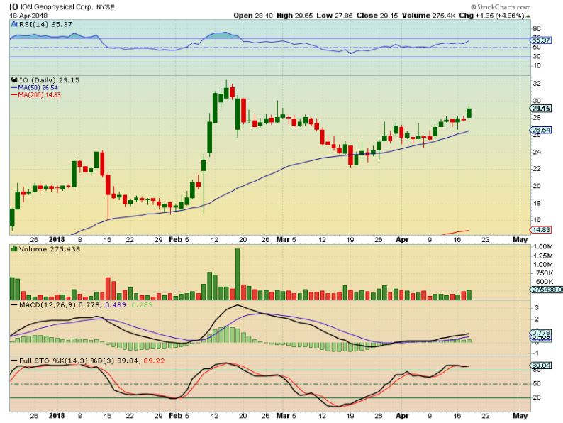 IO –  This was in yesterdays report & other past reports. Weeks ago they released earnings,  announced early pay off of debt, and have bullishly held the 50sma during the market sell down.  I see an inverse H&S, this is still a buy too, especially if it tags that 50sma again.