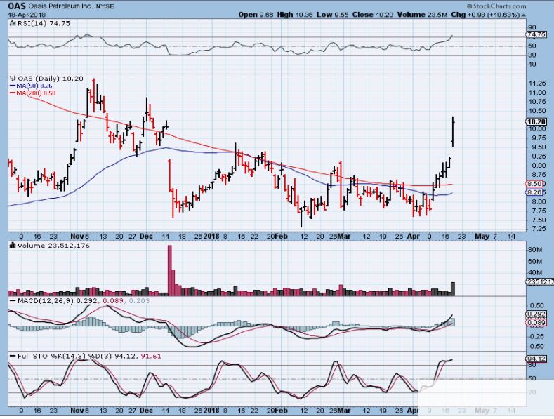 OAS – When I saw ENERGY break out & start running, I recommended a few energy stocks.  I liked OAS , first down at $8.20, and again here at $8.75.