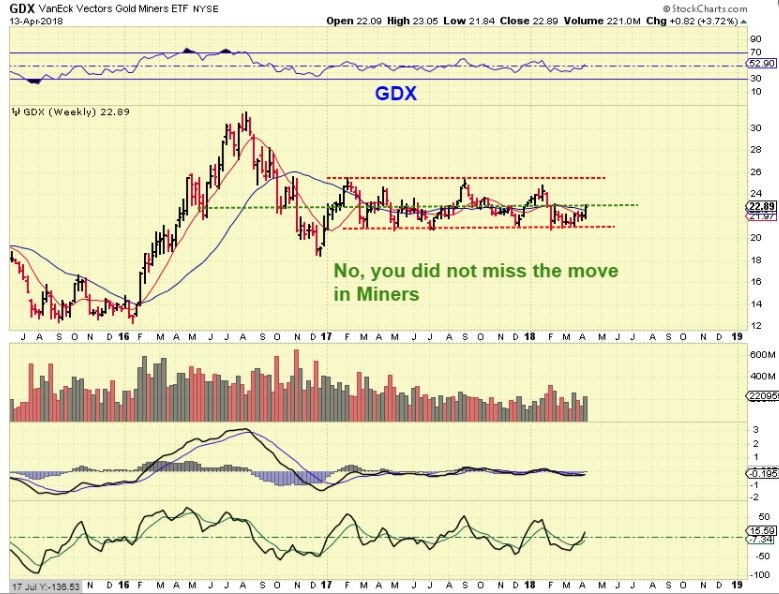 GDX – NOTHING has changed in this long sideways ‘big picture’ consolidation, right? Topping here has happened in the past, or ‘another run higher’ has happened in the past. Miners are  acting bullishly, but these moves are all similar until this breaks out.