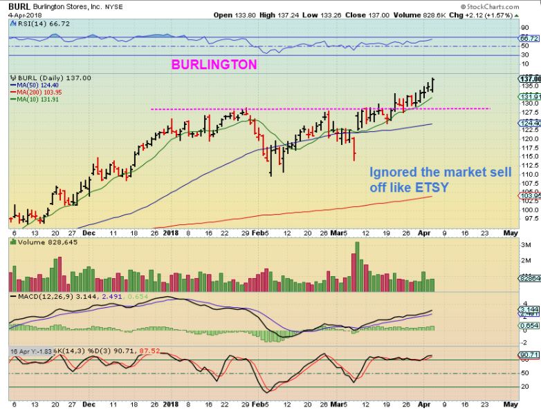 BURL – What? Is this the old Burlington Coat Factory? Feb lows were all that this one dropped into. It then went from $110 to $137 (current highs) as the markets sold off again. CAN YOU BELIEVE THIS? These retail stocks are doing excellent in this choppy sell off.