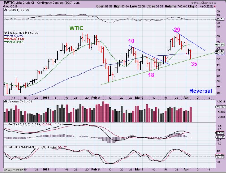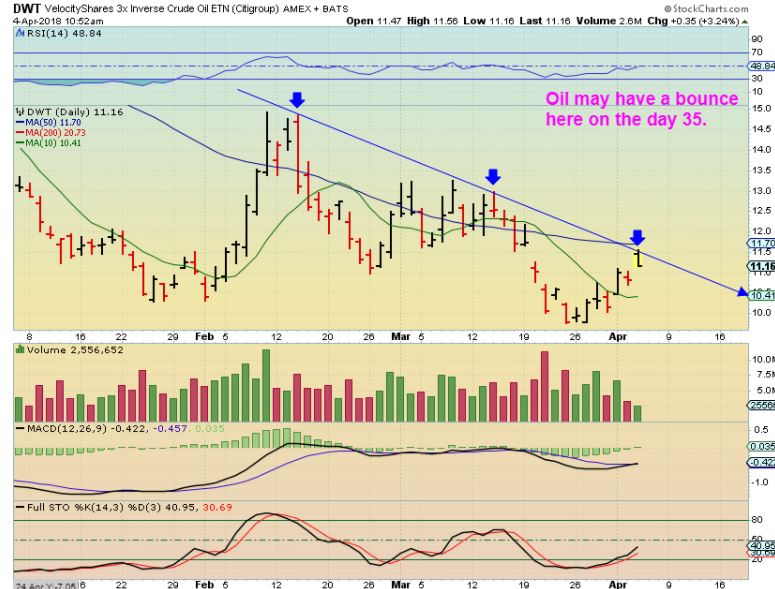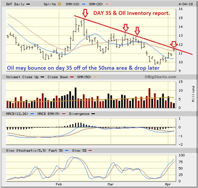 WTIC – With the OIL inventory report release, Oil sold off and then reversed higher. I still expect a drop later, and I have mentioned why, but On day 35, with a 50 day possible daily cycle, I figured that we could get a good bounce off of this trend line.