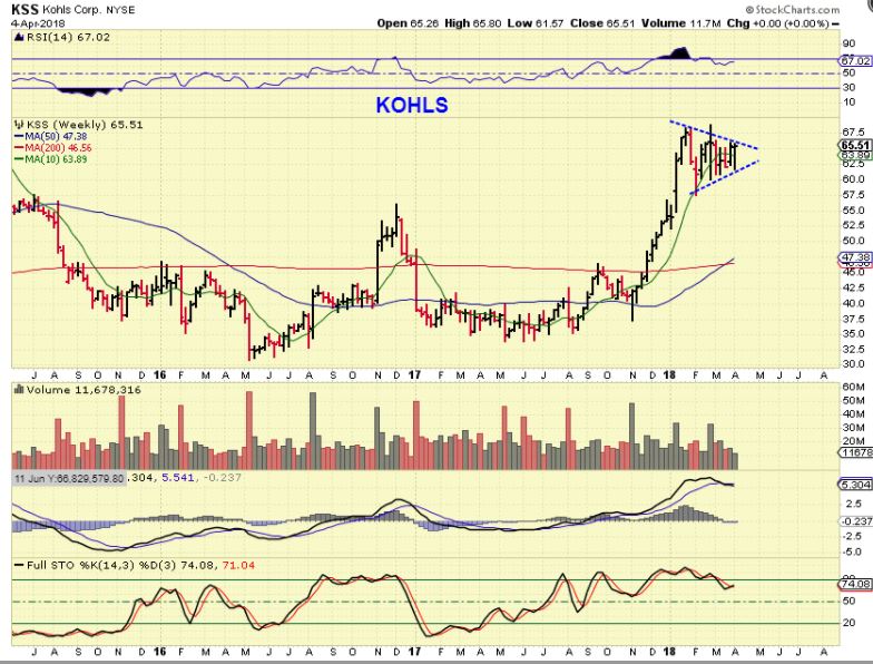 KSS WEEKLY – KOHLS is doing a bull flag after running from roughly $35 to $67. Normally one would buy the break of the flag with a stop at the apex. This is a bit extended, so it makes me a bit reluctant to enter it up this high, but this is a very bullish stock. It has a target of $90+ actually.