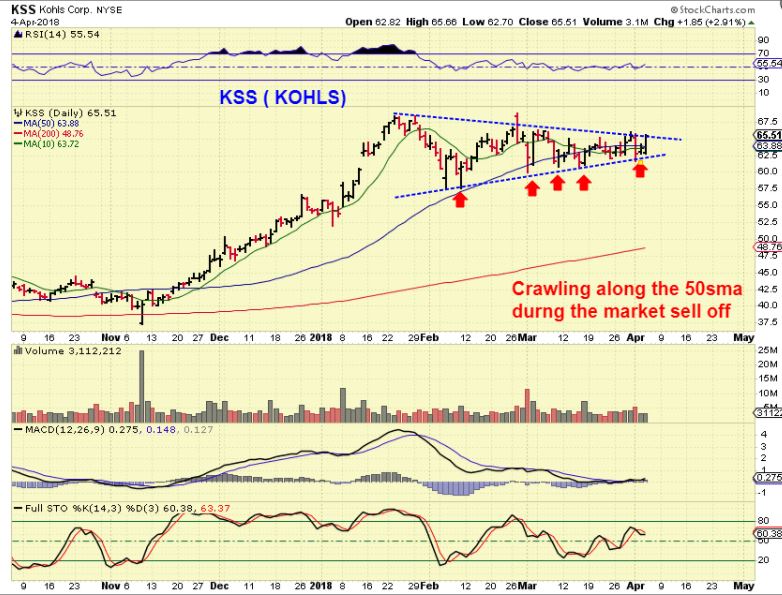 KSS – The daily chart does look less extended ( That is what consolidations are for) and a break higher is low risk and worth a try if you like this sector & set up. Stop below the lower blue trend line. AT LEAST it is not selling off when the markets did.