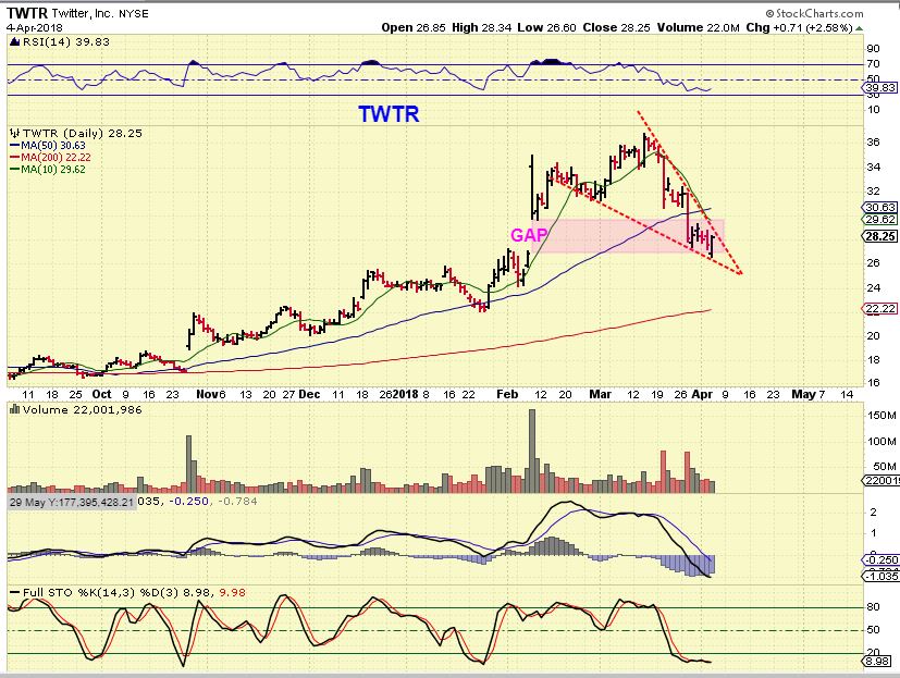TWTR– At a glance, this looks like a Bullish descending wedge and a gap fill. My only hesitation is if this is lumped into the same group as FaceBook. I also see a sharp drop, a bear flag, a sharp drop and a bear flag. Look for a break out higher to buy.
