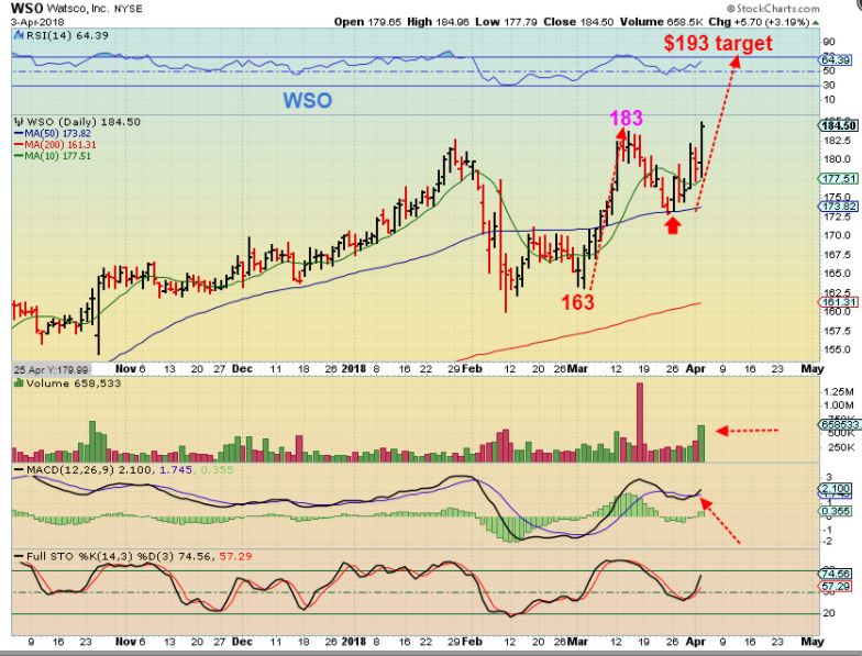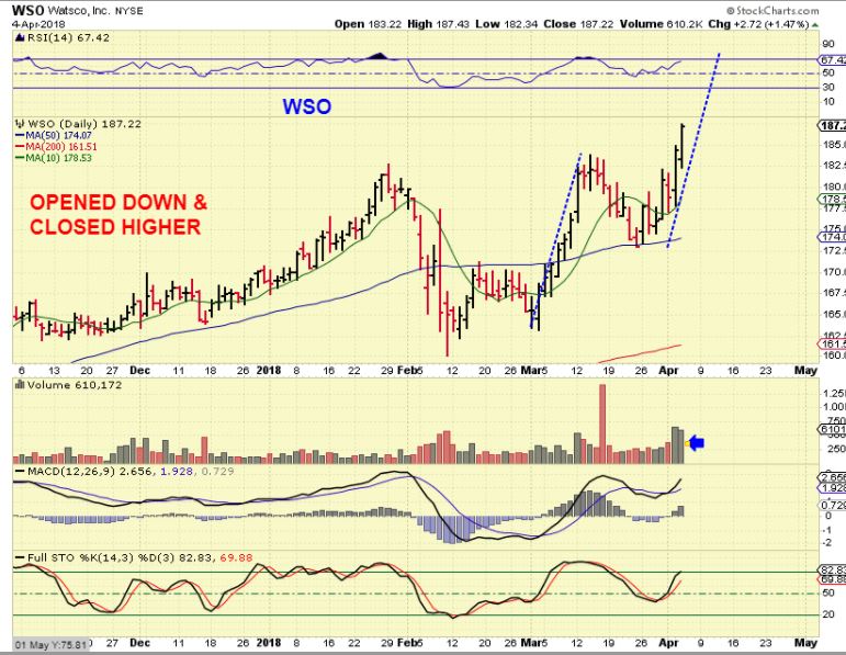 WSO – From yesterdays report, this was pointed out as a very bullish chart, because the FEB lows took it down, the next selling tagged the 50sma, and it was ALREADY AT NEW HIGHS with the Markets selling off.