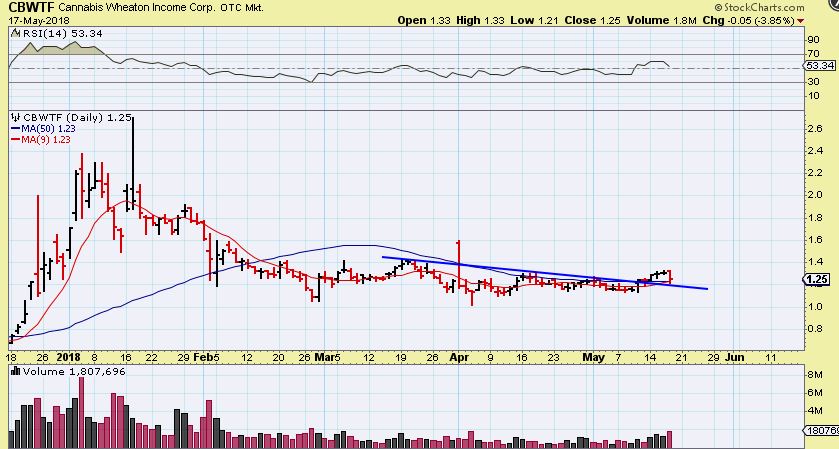 CBWTF – After breaking above the 50sma recently and moving slightly higher day after day, it dropped down today to back test that area. There was concern that the sell off would break down, so I drew the numbers of possible support prices on the chart. It closed at $1.25- so far , so good.