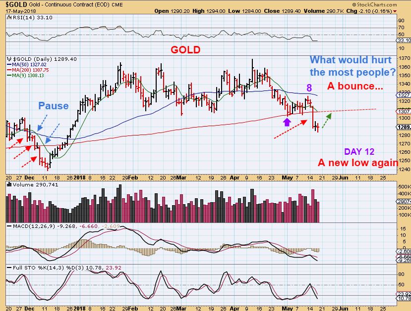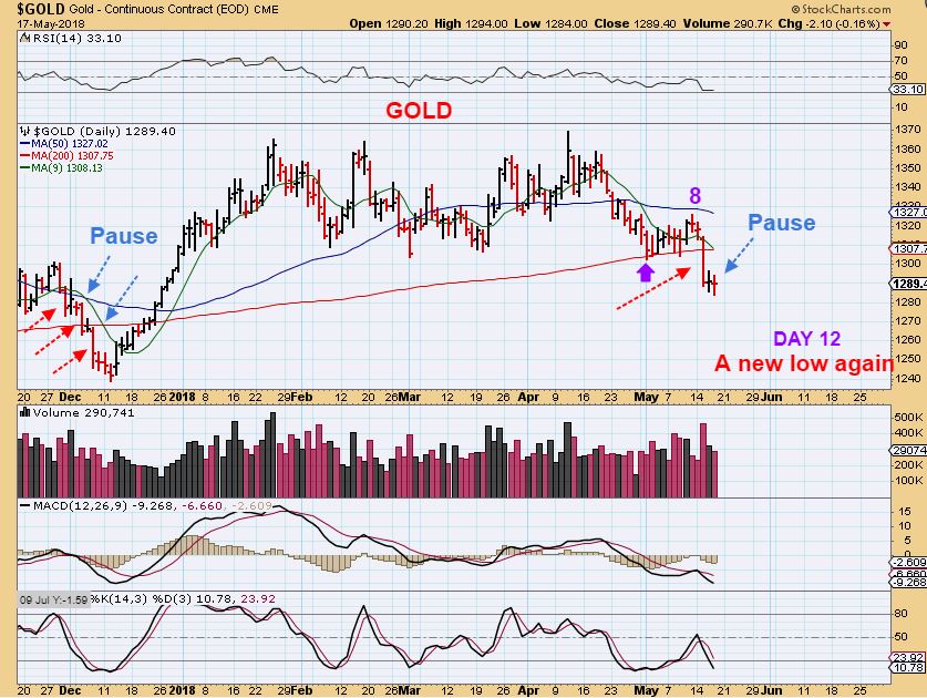 GOLD – Gold made a new low on day 12. Remember when I said that we could get a sharp drop and then a ‘pause’ ? We are getting the pause. I still expect more downside…